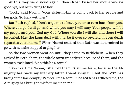 Another classic comes from our text in the book of Ruth - Chapter 9 from The Story - “Where you go, I will go; where you stay, I will stay; your people shall be my people and your God my God” (Ruth 1:16, pg. 122 in The Story). What’s so special about these lines from the Bible? For starters, they are true - these biblical verses are concise summaries of bigger truths, in the same way that movie lines reveal something essential about their characters.