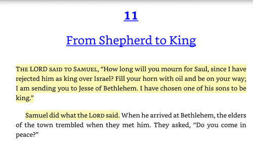 Samuel, the prophet who anointed Saul as king of Israel, now has to anoint “one of Jesse’s sons” as the new king. Samuel expresses hesitation in 1 Samuel 16:2, saying, “How can I go [anoint another king]? If Saul hears about it, he will kill me.” I imagine Samuel struggling with two images of Saul: the anointed king and victor in battle for Israel, and the disobedient man who lost God’s favor.