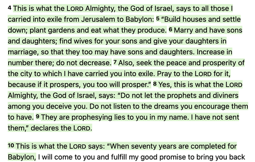Then I read what Jeremiah told the exiles in Babylon (this is from Jeremiah 29:4-10. The Story picks up with Jeremiah 29:10 on page 261.)