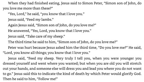 Read John 21:15–19 (the end of chapter 27 of The Story) three times: