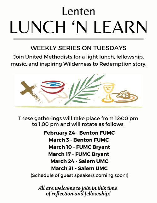 Join United Methodists for a light lunch, fellowship, music, and inspiring Wilderness to Redemption story. The gatherings will take place from noon to 1 p.m. and at either Benton, Bryant or Salem United Methodist church.