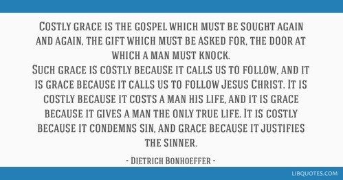 The opposite of cheap grace is costly grace; the grace and love found in the life and love of Jesus. Costly grace confronts us as a gracious call to follow Christ. It comes to us as a word of forgiveness and encouragement to the broken spirit and the contrite heart. It is costly because it compels a person to submit to the yoke of Christ and follow him, even when we have to humble ourselves to persons we disagree, when we are obedient to unjust laws, yet are strong enough to stand up to them while showing the other dignity; when we die a death of embarrassment, of shame, of dishonor – and for some, a physical death – not suited for any of God’s created order. When we follow Jesus, the name above all names, we trust in that his life, death and resurrection can and does cover any darkness in our lives. There is nothing else in this world can we trust in more.