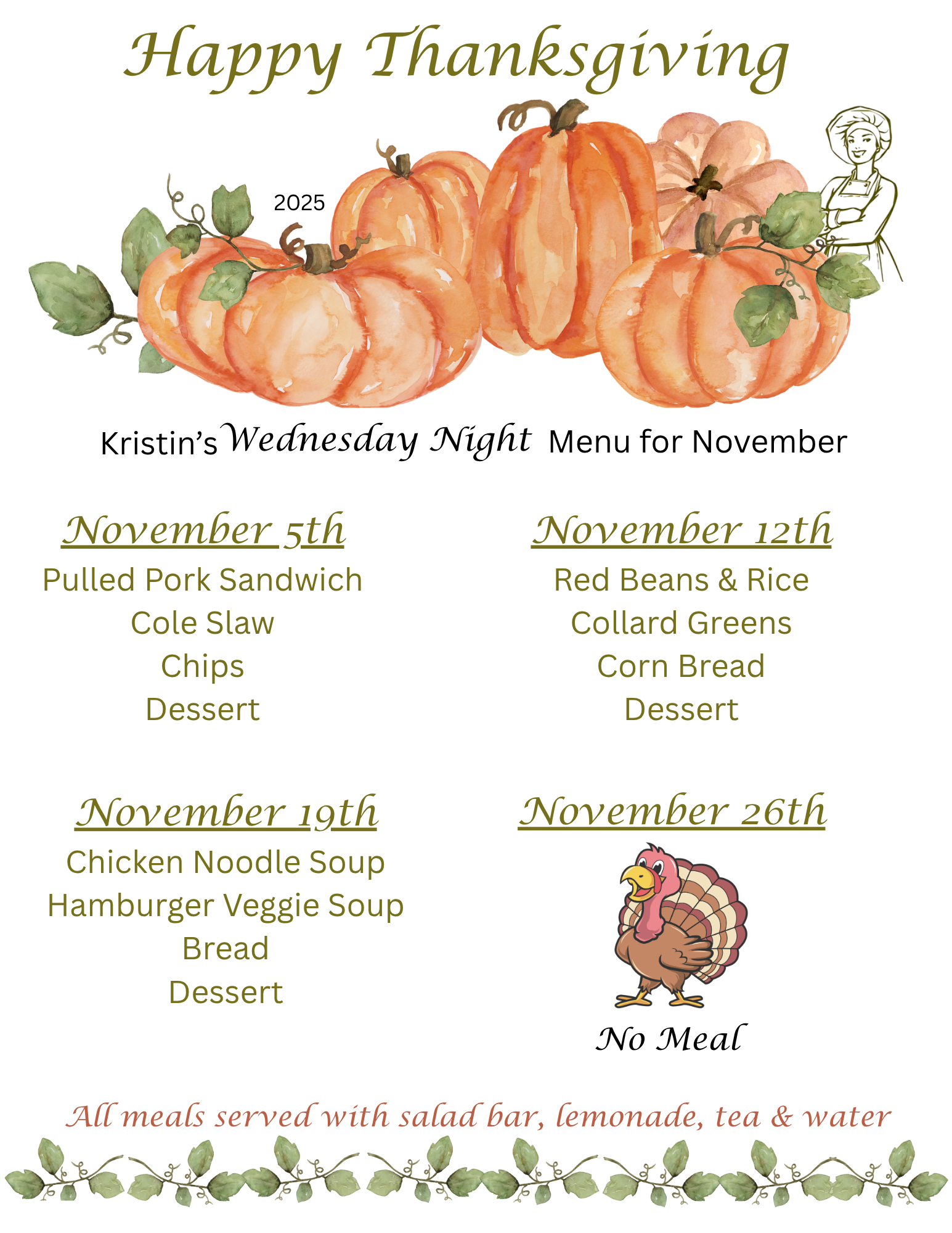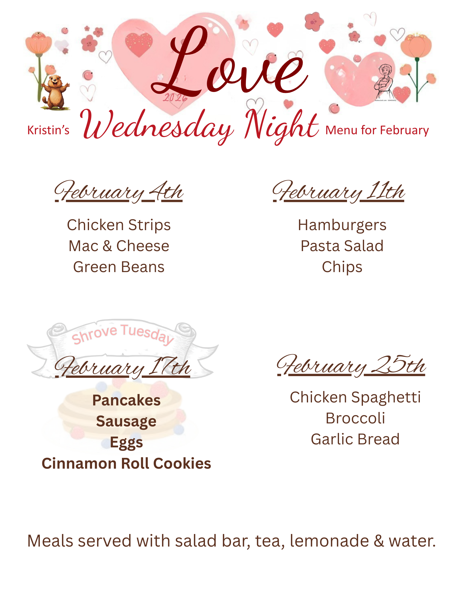 Part of our tradition on Wednesday Nights during the school year is to have a fellowship meal together as well as multiple Bible studies, adult, children, and youth activities, and choir practice. There is something for everyone! Programming for all of our ministries, the weekly schedule, the spring calendar, and our menus can be found below!